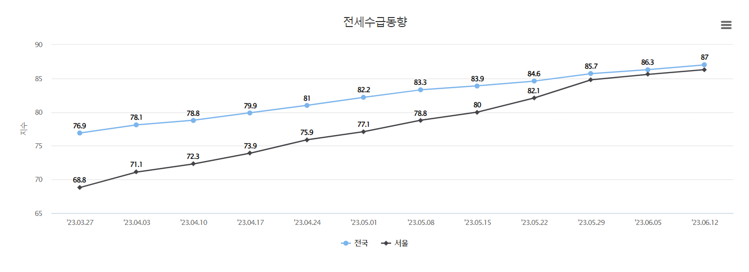 전국의 전세수급동향은 2023년 5월 29일 기준 85.7 포인트를 을 나타내고 있었습니다. 6월 5일 기준 86.3 포인트, 6월 12일 기준 87포인트를 나타내며 조금씩 상승하고 있는 추세입니다. 서울도 비슷한 추세를 보이고 있는데요. 서울의 전세수급동향은 5월 29일 기준 84.8 포인트를 나타내고 있었습니다. 같은 기간을 전국과 비교했을 때, 6월 5일 기준 85.6 포인트, 6월 12일 기준 86.3 포인트를 보이며 상승하고 있습니다.